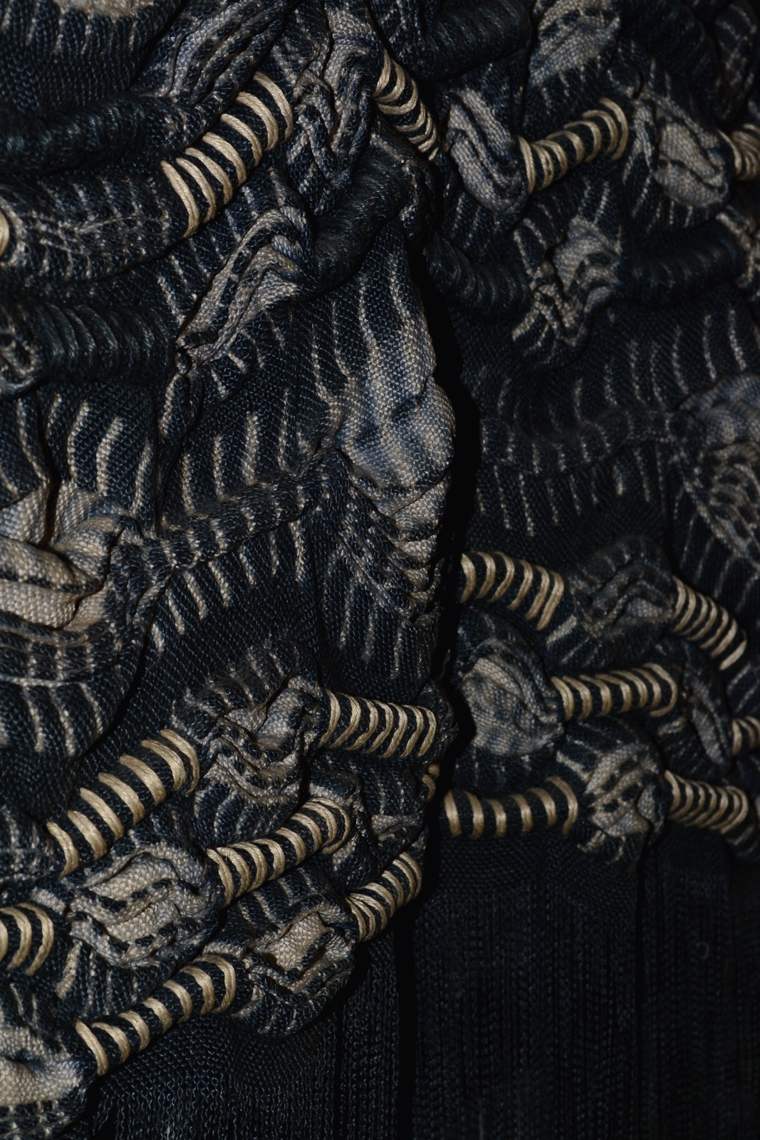 Dyed fabrics that were twisted into ropes that will later be unrolled as in this photo.